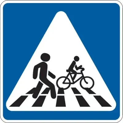 Дорожній знак 5.93.2 "Суміжні пішохідний перехід і велосипедний переїзд" застосовується для позначення місць, де пішохідний перехід і велосипедний переїзд розташовані поруч на відстані не більше ніж 0,4 м один від одного.