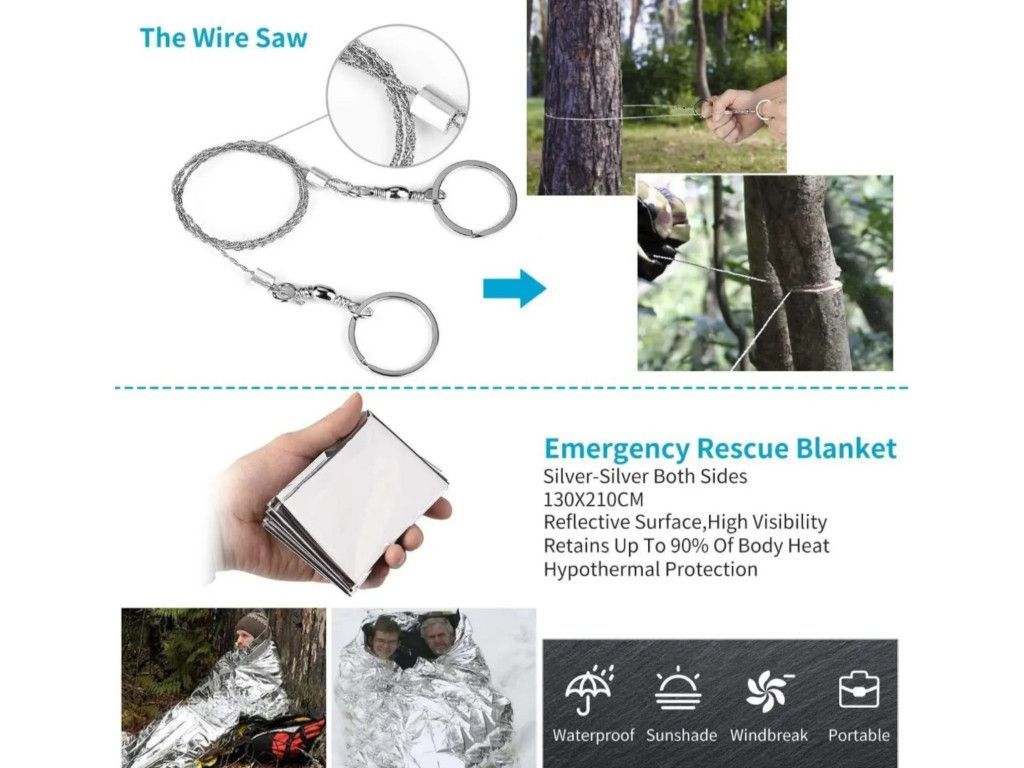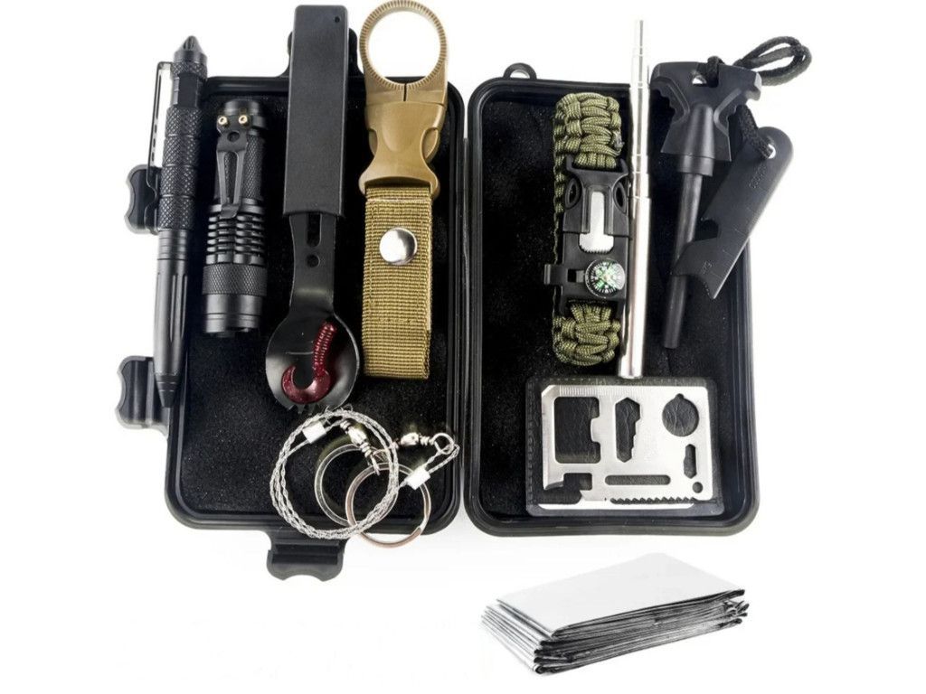 Набор для виживання з аптечкою 11 в 1 Незамінний мультитул-набор в екстримальных ситуаціях, походах, велопрогулках, гірськолижних експедиціях. Набор містить в собі усе необхідне для виживання і надання першої медичної допомоги в услових ограниченых можливостей. Речовий мішок має компактний розмір і може бути розміщений на поясі або рюкзаку Набор містить в собі: ніж повноцінний розкладний багатофункціональний браслет - паракорд ліхтарик столовий прилад ложка, вилка багатофункціональна карта (ключ, викрутка, затиск, лінійка, лезо) пила медичне покривало риболовецьке приладдя (воблер) утримувач для пляшки металева ручка із стеклобоем водонепроникна коробка кремінь Вага кейса 577г Матеріал кейса - высококвалитетный пластик Размір кейса - 17х11х4,5 см