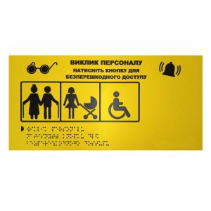 Тактильна табличка для слабозорих та незрячих "Кнопка виклику персоналу-2" 15см*30см Тактильні інформаційні покажчики (таблички зі шрифтом Брайля для слабозорих, незрячих та людей з маломобільних груп населення) застосовуються згідно з "ДБН В.2.2-40:2018 Інклюзивність будівель і споруд" за програмою першої леді країни Олени Зеленської "Доступна Україна". Дані норми відносяться до всіх будівель та споруд незалежно від сфери застосування та форми власності для забезпечення доступності та вільного орієнтування у просторі людей з особливими потребами та маломобільних груп населення (МГН). Ми виготовляємо таблички відповідно до вищезгаданих ДБН та ГОСТ ISO 17049. Ця табличка повинна нести інформацію плоскодрукованим текстом (тобто об'ємним), що дублюється шрифтом Брайля, так як згідно зі статистикою лише від 7% до 10% незрячих людей вивчали шрифт Брайля, саме тому таблички несуть інформацію на кирилиці з дубльованою інформацією рельєфно-крапковим шрифтом Брайля. Також ще один важливий момент - дані таблички потрібні не тільки незрячим, а й людям з вадами зору, саме з цією метою інформація наноситься збільшеною і контрастним кольором по відношенню до фону, у нашому випадку жовте тло і чорне зображення. Чому саме жовтого, а не синього чи червоного кольору? Причина проста: жовтий колір - останній колір спектру, який можуть розрізняти слабозорі люди. Дані таблички кріплять праворуч від дверей на відстані 25-30см від дверей і на висоті 120-150см від рівня підлоги. Не просто розташовується саме біля дверей, а не на самих дверях, бо таблички потрібні для слабозорих і незрячих, а це може бути небезпечно для цієї категорії людей. Уявімо ситуацію, коли табличку для незрячих повісили на двері, людина стоїть читає пальцями інформацію на табличці і в цей момент відчиняються двері – травма забезпечена! Наша компанія виготовить вам таблички будь-яких розмірів і кольорів з урахуванням вашого корпоративного стилю. Пишіть нам у Вайбері або зв'язуйтесь з нами у зручний для вас спосіб і наші фахівці обов'язково допоможуть вам із забезпеченням доступного середовища на вашому підприємстві. Для замовлення тактильних табличок пишіть у Вайбер за номером +380990100067