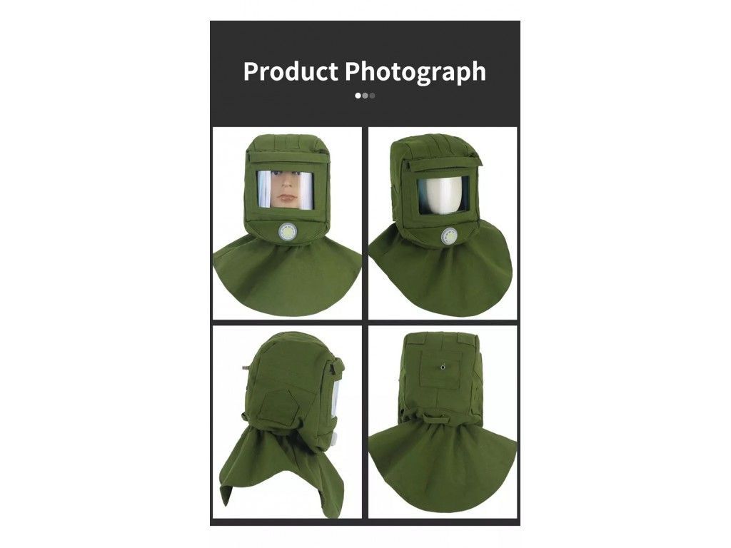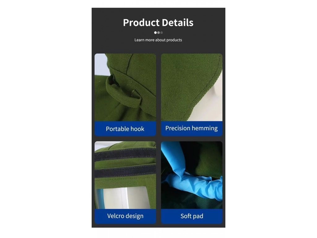 Піскоструминна захисна маска для обличчя Капюшон Вітровий пил прикриття піскоструминний шолом Призначений для захисту вашого обличчя від пилу Висока якість і повітропроникність, зручний в носінні Ідеально підходить для шліфування, піскоструминної обробки, рідкого напилення і т. Д. Конструкція вентиляції: Переконайтеся, що це не впливає на дихання в тривалий робочий час. Усередині використовується еластична структура. Ефективно запобігає попаданню пилу і дрібного пилу. Специфікація: Матеріал: Полотно + Скло Колір: Армійський зелений Розміри: прим. 290x270x22 мм /11.41x10.62x8.66 дюйма