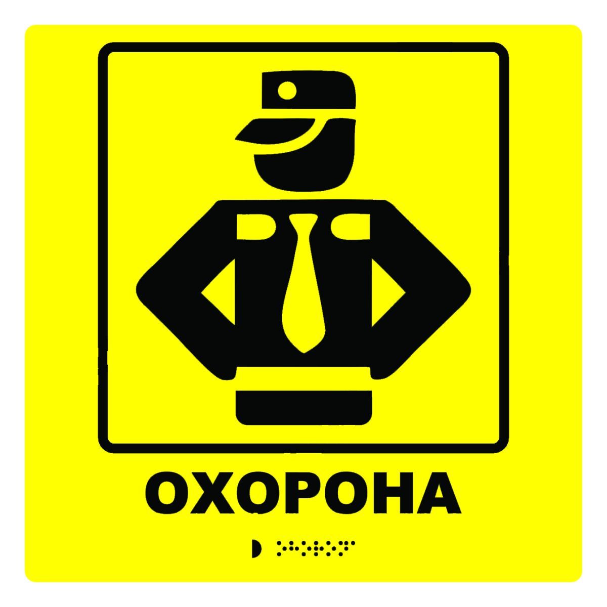 Тактильна табличка для слабозорих та незрячих "Охорона" 25см*25см Тактильні інформаційні покажчики (таблички зі шрифтом Брайля для слабозорих, незрячих та людей з маломобільних груп населення) застосовуються згідно з "ДБН В.2.2-40:2018 Інклюзивність будівель і споруд" за програмою першої леді країни Олени Зеленської "Доступна Україна". Дані норми відносяться до всіх будівель та споруд незалежно від сфери застосування та форми власності для забезпечення доступності та вільного орієнтування у просторі людей з особливими потребами та маломобільних груп населення (МГН). Ми виготовляємо таблички відповідно до вищезгаданих ДБН та ГОСТ ISO 17049. Ця табличка повинна нести інформацію плоскодрукованим текстом (тобто об'ємним), що дублюється шрифтом Брайля, так як згідно зі статистикою лише від 7% до 10% незрячих людей вивчали шрифт Брайля, саме тому таблички несуть інформацію на кирилиці з дубльованою інформацією рельєфно-крапковим шрифтом Брайля. Також ще один важливий момент - дані таблички потрібні не тільки незрячим, а й людям з вадами зору, саме з цією метою інформація наноситься збільшеною і контрастним кольором по відношенню до фону, у нашому випадку жовте тло і чорне зображення. Чому саме жовтого, а не синього чи червоного кольору? Причина проста: жовтий колір - останній колір спектру, який можуть розрізняти слабозорі люди. Дані таблички кріплять праворуч від дверей на відстані 25-30см від дверей і на висоті 120-150см від рівня підлоги. Не просто розташовується саме біля дверей, а не на самих дверях, бо таблички потрібні для слабозорих і незрячих, а це може бути небезпечно для цієї категорії людей. Уявімо ситуацію, коли табличку для незрячих повісили на двері, людина стоїть читає пальцями інформацію на табличці і в цей момент відчиняються двері – травма забезпечена! Наша компанія виготовить вам таблички будь-яких розмірів і кольорів з урахуванням вашого корпоративного стилю. Пишіть нам у Вайбері за номером +380990100067 або зв'язуйтесь з нами у зручний для вас спосіб і наші фахівці обов'язково допоможуть вам із забезпеченням доступного середовища на вашому підприємстві. Для замовлення тактильних табличок пишіть у Вайбер за номером +380990100067
