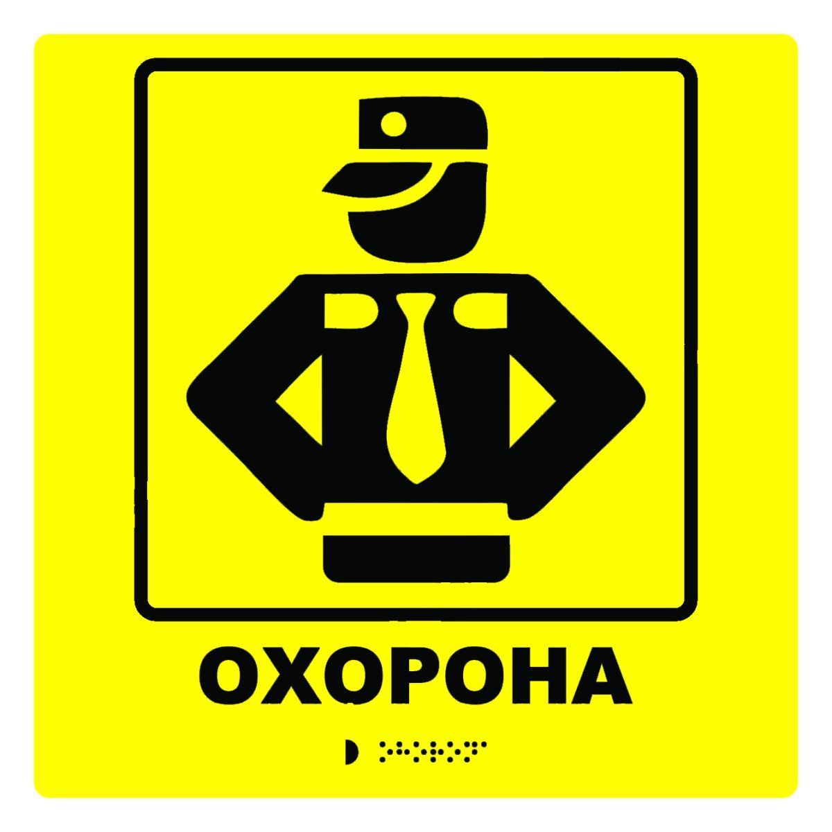 Тактильна табличка для слабозорих та незрячих "Охорона" 25см*25см Тактильні інформаційні покажчики (таблички зі шрифтом Брайля для слабозорих, незрячих та людей з маломобільних груп населення) застосовуються згідно з "ДБН В.2.2-40:2018 Інклюзивність будівель і споруд" за програмою першої леді країни Олени Зеленської "Доступна Україна". Дані норми відносяться до всіх будівель та споруд незалежно від сфери застосування та форми власності для забезпечення доступності та вільного орієнтування у просторі людей з особливими потребами та маломобільних груп населення (МГН). Ми виготовляємо таблички відповідно до вищезгаданих ДБН та ГОСТ ISO 17049. Ця табличка повинна нести інформацію плоскодрукованим текстом (тобто об'ємним), що дублюється шрифтом Брайля, так як згідно зі статистикою лише від 7% до 10% незрячих людей вивчали шрифт Брайля, саме тому таблички несуть інформацію на кирилиці з дубльованою інформацією рельєфно-крапковим шрифтом Брайля. Також ще один важливий момент - дані таблички потрібні не тільки незрячим, а й людям з вадами зору, саме з цією метою інформація наноситься збільшеною і контрастним кольором по відношенню до фону, у нашому випадку жовте тло і чорне зображення. Чому саме жовтого, а не синього чи червоного кольору? Причина проста: жовтий колір - останній колір спектру, який можуть розрізняти слабозорі люди. Дані таблички кріплять праворуч від дверей на відстані 25-30см від дверей і на висоті 120-150см від рівня підлоги. Не просто розташовується саме біля дверей, а не на самих дверях, бо таблички потрібні для слабозорих і незрячих, а це може бути небезпечно для цієї категорії людей. Уявімо ситуацію, коли табличку для незрячих повісили на двері, людина стоїть читає пальцями інформацію на табличці і в цей момент відчиняються двері – травма забезпечена! Наша компанія виготовить вам таблички будь-яких розмірів і кольорів з урахуванням вашого корпоративного стилю. Пишіть нам у Вайбері за номером +380990100067 або зв'язуйтесь з нами у зручний для вас спосіб і наші фахівці обов'язково допоможуть вам із забезпеченням доступного середовища на вашому підприємстві. Для замовлення тактильних табличок пишіть у Вайбер за номером +380990100067