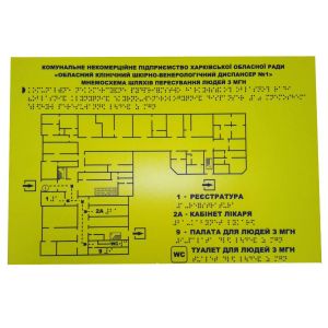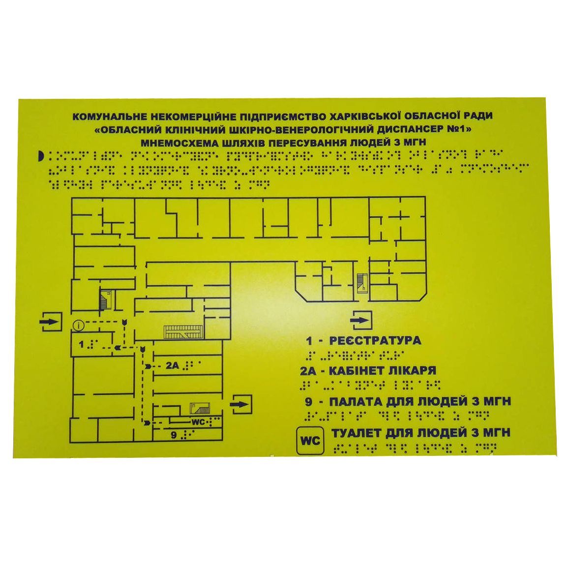 Тактильні інформаційні покажчики (таблички зі шрифтом Брайля для слабозорих, незрячих та людей з маломобільних груп населення) застосовуються згідно з "ДБН В.2.2-40:2018 Інклюзивність будівель і споруд" за програмою першої леді країни Олени Зеленської "Доступна Україна". Дані норми відносяться до всіх будівель та споруд незалежно від сфери застосування та форми власності для забезпечення доступності та вільного орієнтування у просторі людей з особливими потребами та маломобільних груп населення (МГН). Ми виготовляємо таблички відповідно до вищезгаданих ДБН та ГОСТ ISO 17049. Ця табличка повинна нести інформацію плоскодрукованим текстом (тобто об'ємним), що дублюється шрифтом Брайля, так як згідно зі статистикою лише від 7% до 10% незрячих людей вивчали шрифт Брайля, саме тому таблички несуть інформацію на кирилиці з дубльованою інформацією рельєфно-крапковим шрифтом Брайля. Також ще один важливий момент - дані таблички потрібні не тільки незрячим, а й людям з вадами зору, саме з цією метою інформація наноситься збільшеною і контрастним кольором по відношенню до фону, у нашому випадку жовте тло і чорне зображення. Чому саме жовтого, а не синього чи червоного кольору? Причина проста: жовтий колір - останній колір спектру, який можуть розрізняти слабозорі люди. Дані таблички кріплять праворуч від дверей на відстані 25-30см від дверей і на висоті 120-150см від рівня підлоги. Не просто розташовується саме біля дверей, а не на самих дверях, бо таблички потрібні для слабозорих і незрячих, а це може бути небезпечно для цієї категорії людей. Уявімо ситуацію, коли табличку для незрячих повісили на двері, людина стоїть читає пальцями інформацію на табличці і в цей момент відчиняються двері – травма забезпечена! Наша компанія виготовить вам таблички будь-яких розмірів і кольорів з урахуванням вашого корпоративного стилю. Пишіть нам у Вайбері за номером +380990100067 або зв'язуйтесь з нами у зручний для вас спосіб і наші фахівці обов'язково допоможуть вам із забезпеченням доступного середовища на вашому підприємстві. Для замовлення тактильних табличок пишіть у Вайбер за номером +380990100067