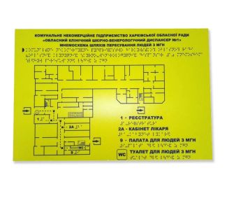 Тактильні інформаційні покажчики (таблички зі шрифтом Брайля для слабозорих, незрячих та людей з маломобільних груп населення) застосовуються згідно з "ДБН В.2.2-40:2018 Інклюзивність будівель і споруд" за програмою першої леді країни Олени Зеленської "Доступна Україна". Дані норми відносяться до всіх будівель та споруд незалежно від сфери застосування та форми власності для забезпечення доступності та вільного орієнтування у просторі людей з особливими потребами та маломобільних груп населення (МГН). Ми виготовляємо таблички відповідно до вищезгаданих ДБН та ГОСТ ISO 17049. Ця табличка повинна нести інформацію плоскодрукованим текстом (тобто об'ємним), що дублюється шрифтом Брайля, так як згідно зі статистикою лише від 7% до 10% незрячих людей вивчали шрифт Брайля, саме тому таблички несуть інформацію на кирилиці з дубльованою інформацією рельєфно-крапковим шрифтом Брайля. Також ще один важливий момент - дані таблички потрібні не тільки незрячим, а й людям з вадами зору, саме з цією метою інформація наноситься збільшеною і контрастним кольором по відношенню до фону, у нашому випадку жовте тло і чорне зображення. Чому саме жовтого, а не синього чи червоного кольору? Причина проста: жовтий колір - останній колір спектру, який можуть розрізняти слабозорі люди. Дані таблички кріплять праворуч від дверей на відстані 25-30см від дверей і на висоті 120-150см від рівня підлоги. Не просто розташовується саме біля дверей, а не на самих дверях, бо таблички потрібні для слабозорих і незрячих, а це може бути небезпечно для цієї категорії людей. Уявімо ситуацію, коли табличку для незрячих повісили на двері, людина стоїть читає пальцями інформацію на табличці і в цей момент відчиняються двері – травма забезпечена! Наша компанія виготовить вам таблички будь-яких розмірів і кольорів з урахуванням вашого корпоративного стилю. Пишіть нам у Вайбері за номером +380990100067 або зв'язуйтесь з нами у зручний для вас спосіб і наші фахівці обов'язково допоможуть вам із забезпеченням доступного середовища на вашому підприємстві. Для замовлення тактильних табличок пишіть у Вайбер за номером +380990100067