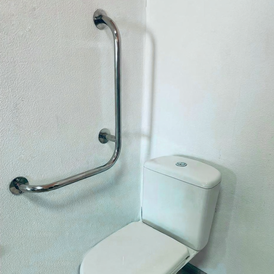 Кутовий поручень призначений для використання в санвузлі, ванній кімнаті та інших приміщеннях, де хворим та ослабленим людям необхідна додаткова опора під час підйому та переміщення. Кутова форма поручня сприяє кращому утриманню. Кріплення поручня проводиться кріпильними елементами з фіксацією у трьох точках.