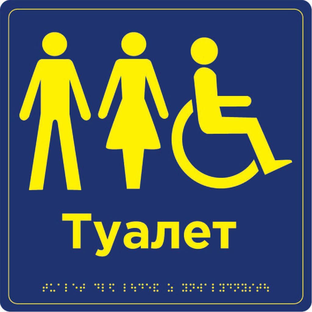Тактильна поверхня з рельєфними написами українською, англійською мовами та шрифтом Брайля дозволяє людям із порушеннями зору легко орієнтуватися у просторі та самостійно знаходити спеціально обладнані туалетні кімнати.