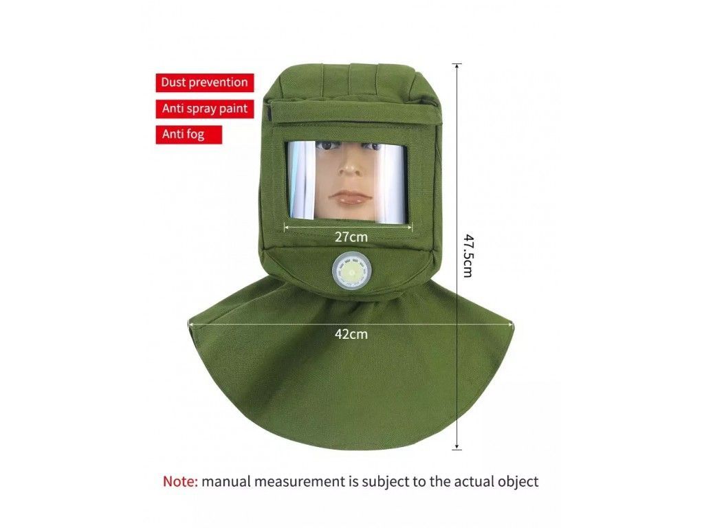 Піскоструминна захисна маска для обличчя Капюшон Вітровий пил прикриття піскоструминний шолом Призначений для захисту вашого обличчя від пилу Висока якість і повітропроникність, зручний в носінні Ідеально підходить для шліфування, піскоструминної обробки, рідкого напилення і т. Д. Конструкція вентиляції: Переконайтеся, що це не впливає на дихання в тривалий робочий час. Усередині використовується еластична структура. Ефективно запобігає попаданню пилу і дрібного пилу. Специфікація: Матеріал: Полотно + Скло Колір: Армійський зелений Розміри: прим. 290x270x22 мм /11.41x10.62x8.66 дюйма