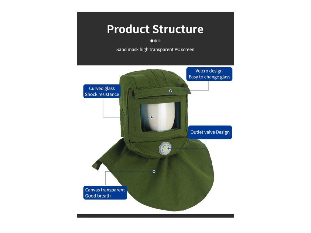 Піскоструминна маска 360 ° захист від пилу скляна поверхня окуляра протитуманна маска для того, що розпиляло фарб Піскоструминна захисна маска для обличчя Капюшон Вітровий пил прикриття піскоструминний шолом Призначений для захисту вашого обличчя від пилу Висока якість і повітропроникність, зручний в носінні Ідеально підходить для шліфування, піскоструминної обробки, рідкого напилення і т. Д. Конструкція вентиляції: Переконайтеся, що це не впливає на дихання в тривалий робочий час. Усередині використовується еластична структура. Ефективно запобігає попаданню пилу і дрібного пилу. Специфікація: Матеріал: Полотно + Скло Колір: Армійський зелений Розміри: прим. 290x270x22 мм /11.41x10.62x8.66 дюйма
