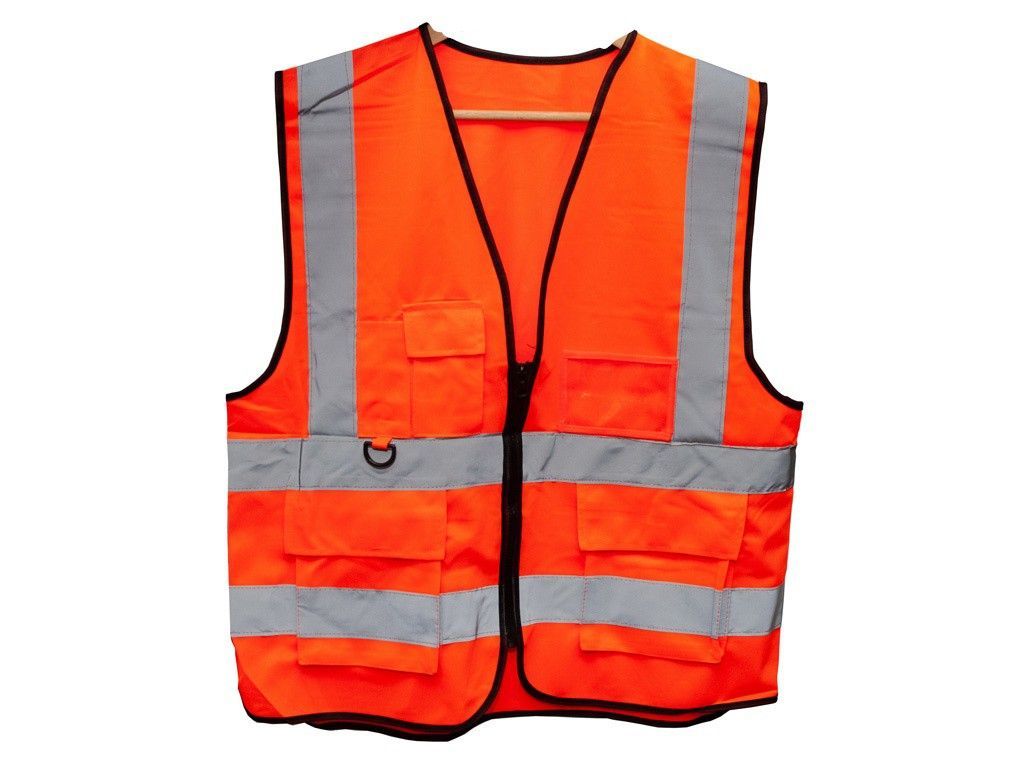 Світловідбиваючий сигнальний жилет із помаранчевими кишенями – це функціональний спецодяг, що забезпечує високу видимість і зручність завдяки додатковим кишеням для зберігання інструментів або дрібних речей.